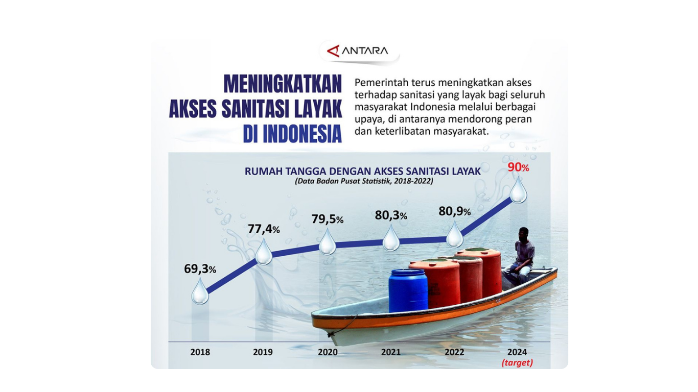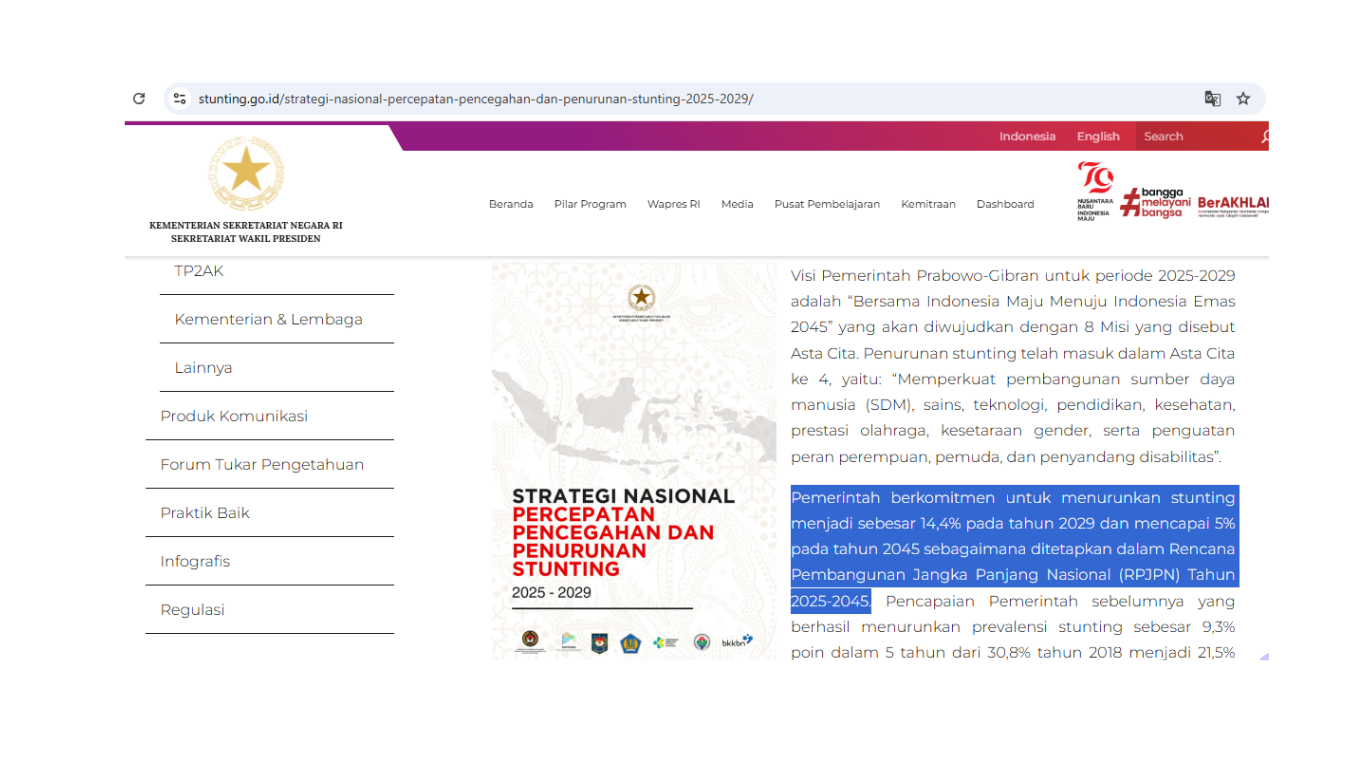 Pemerintah berkomitmen untuk menurunkan stunting menjadi sebesar 14,4% pada tahun 2029 dan mencapai 5% pada tahun 2045 sebagaimana ditetapkan dalam Rencana Pembangunan Jangka Panjang Nasional (RPJPN) Tahun 2025-2045.*) Salah satu pendekatan penting dalam strategi ini adalah penyediaan akses sanitasi layak dan aman sebagai intervensi sensitif yang mendukung kesehatan lingkungan keluarga.